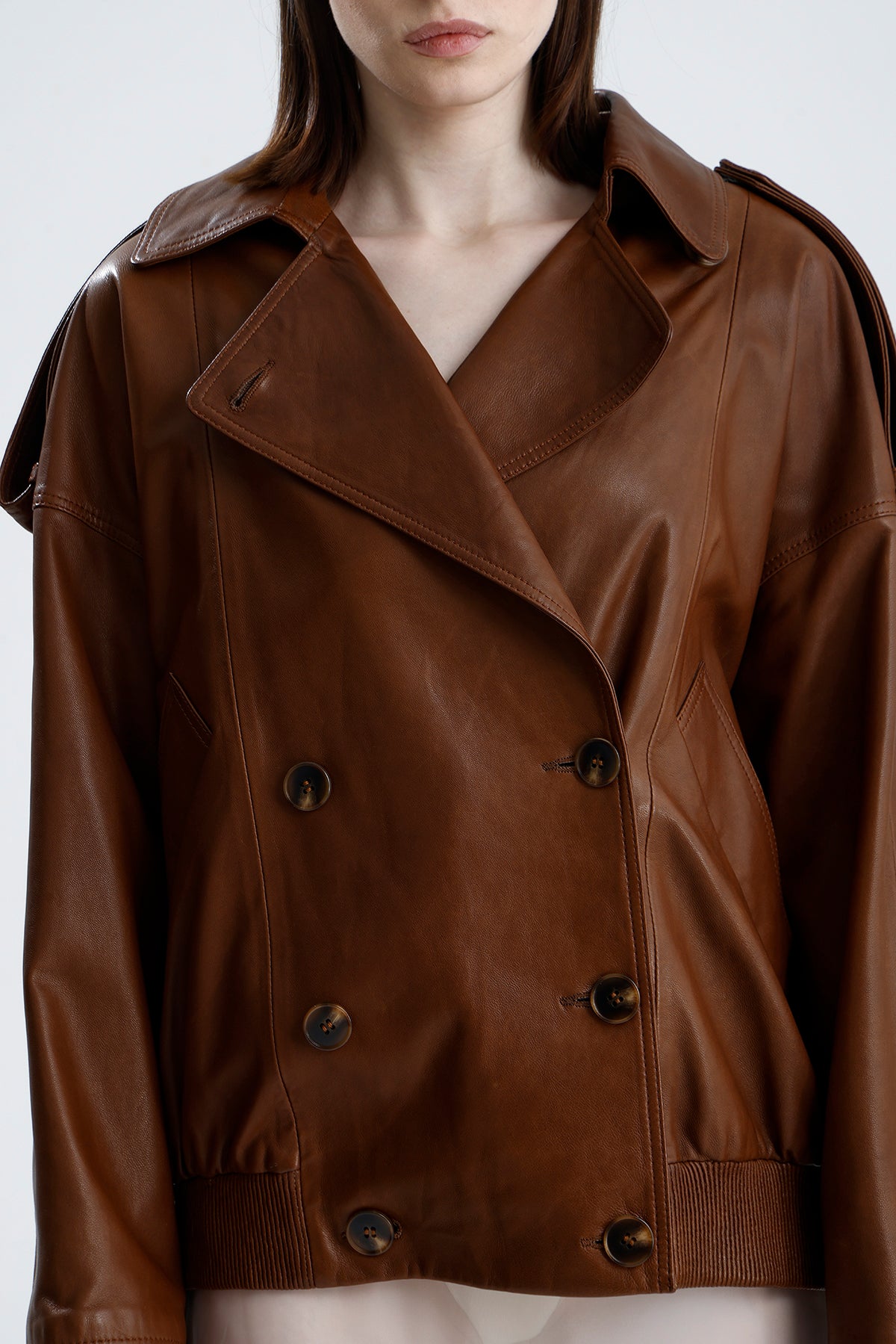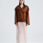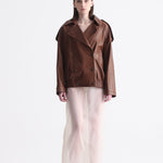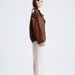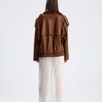 Drew is a sleek biker style jacket in terra flame lamb leather. Its cropped fit and fiery tone makes it a statement essential designed for women who like their classics with a modern edge.