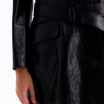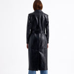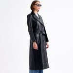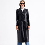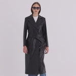 The Reina Coat is a sleek, long overcoat made from crackled leather, offering a firm fit that flatters the silhouette.