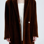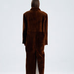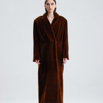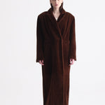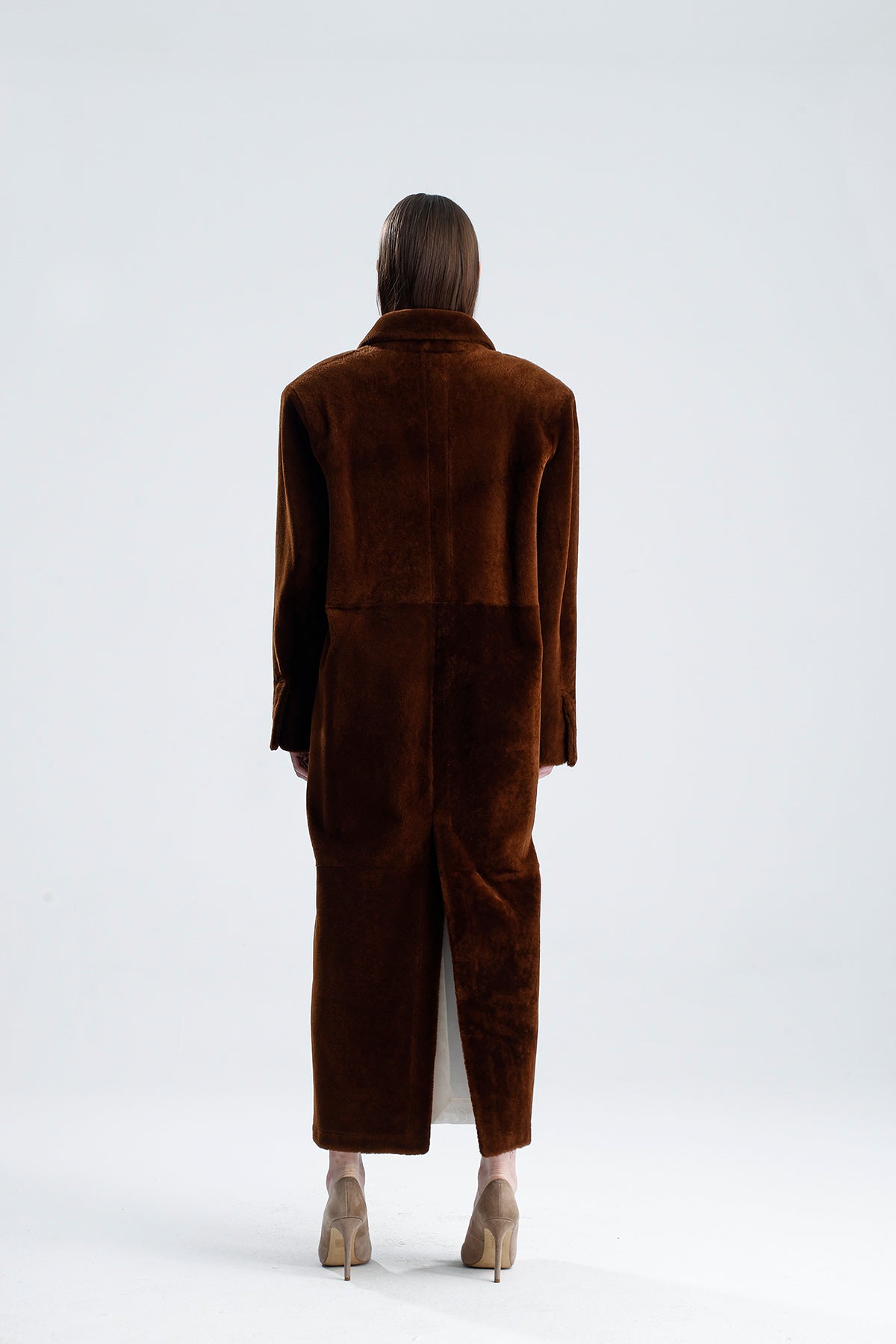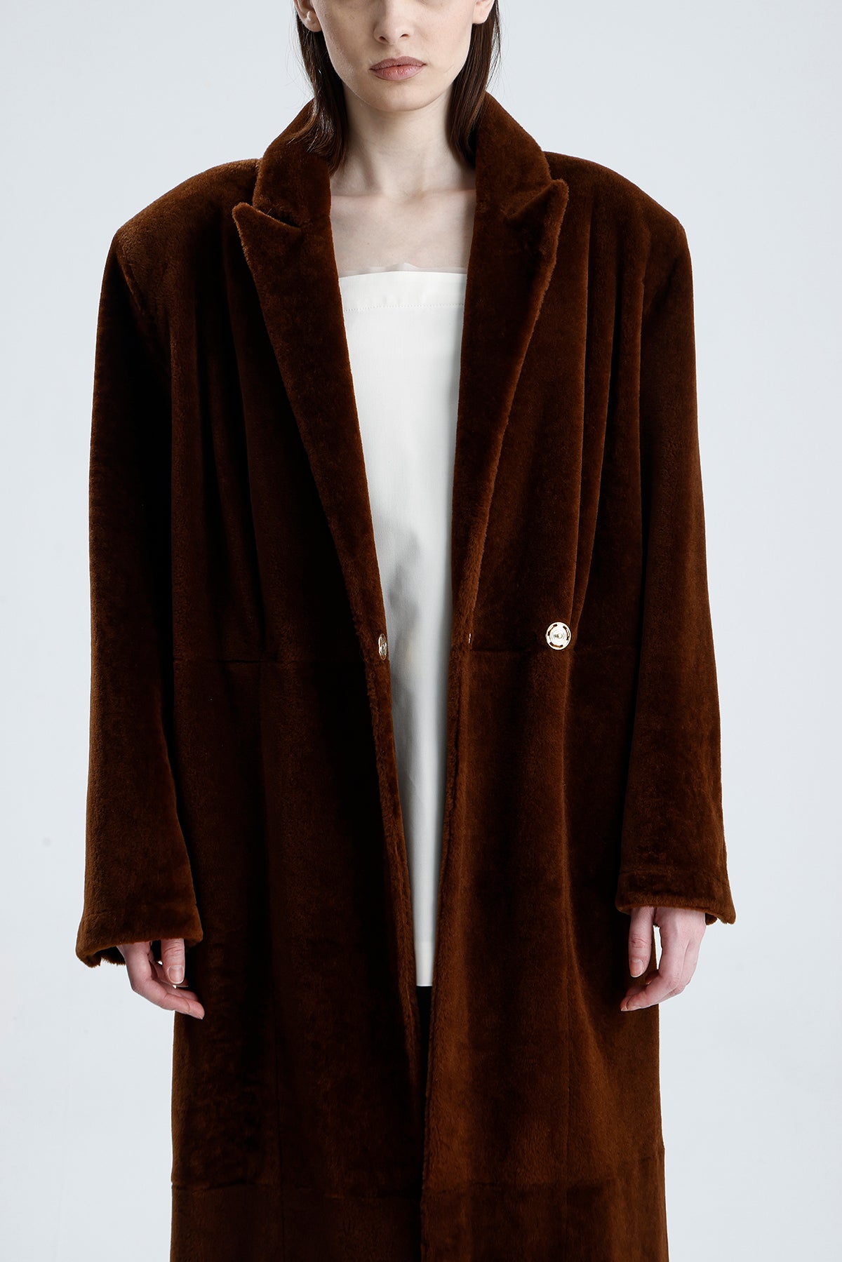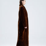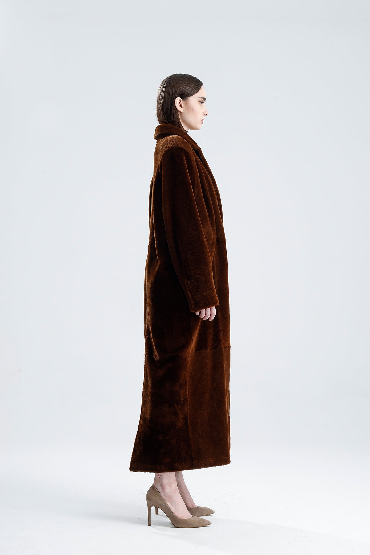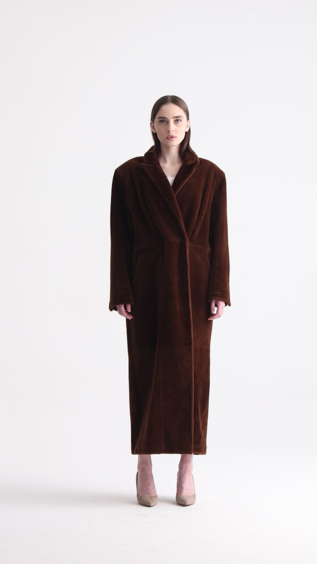 Delphine is a showpiece. A long tailored coat in rich mahogany merino shearling, it offers drama, elegance and warmth, the ultimate winter coat for modern sophistication.