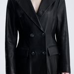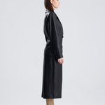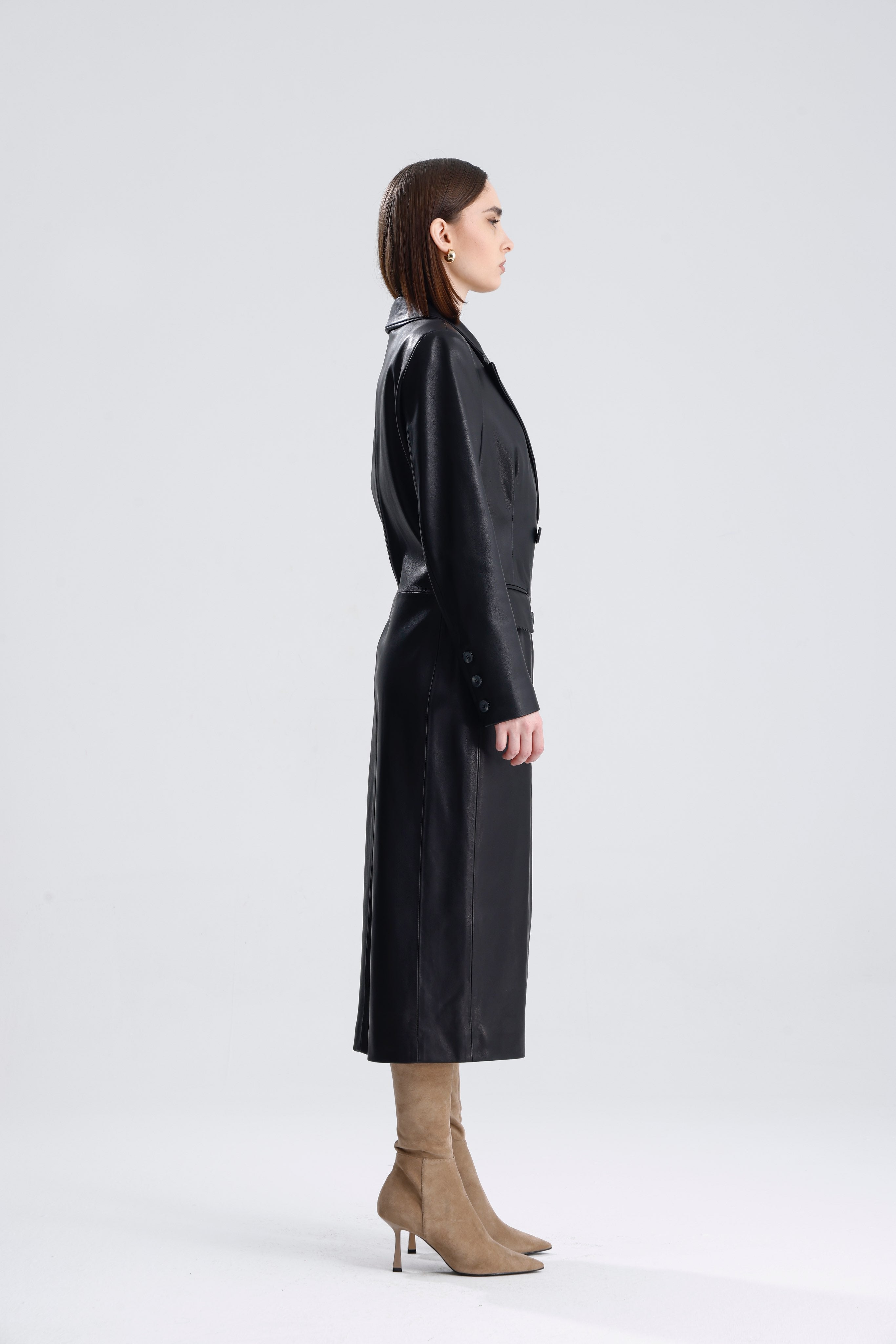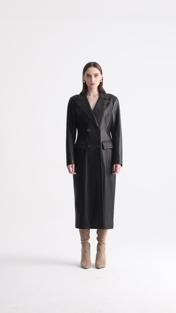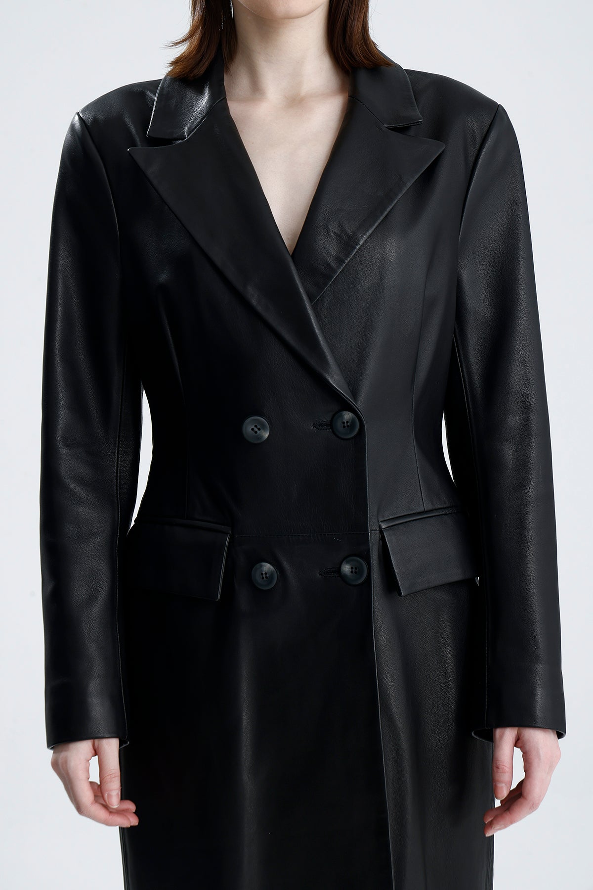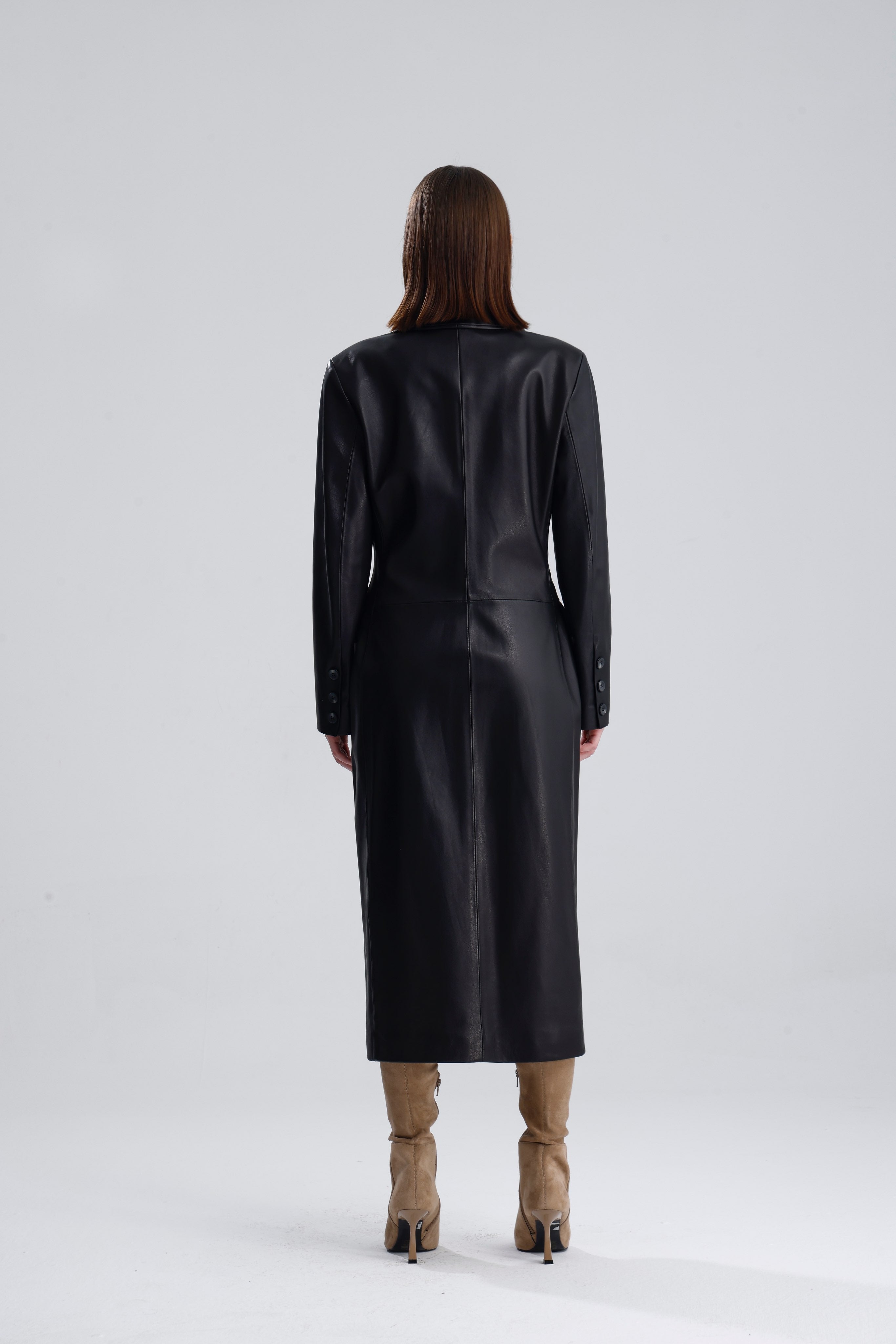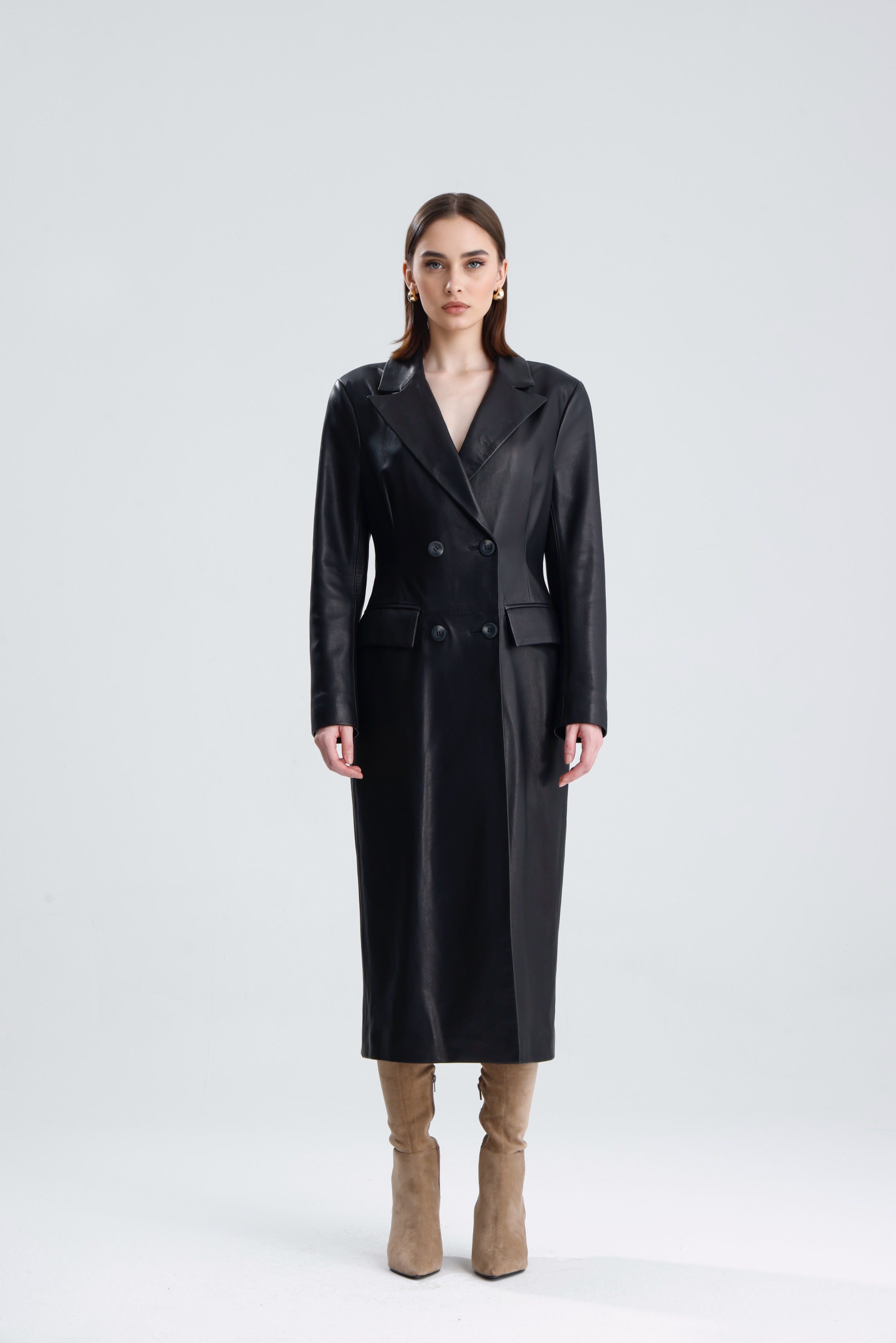 Elara is power dressing perfected. In rich ebony lamb leather, its sleek lines and timeless design make it an investment coat for years to come.