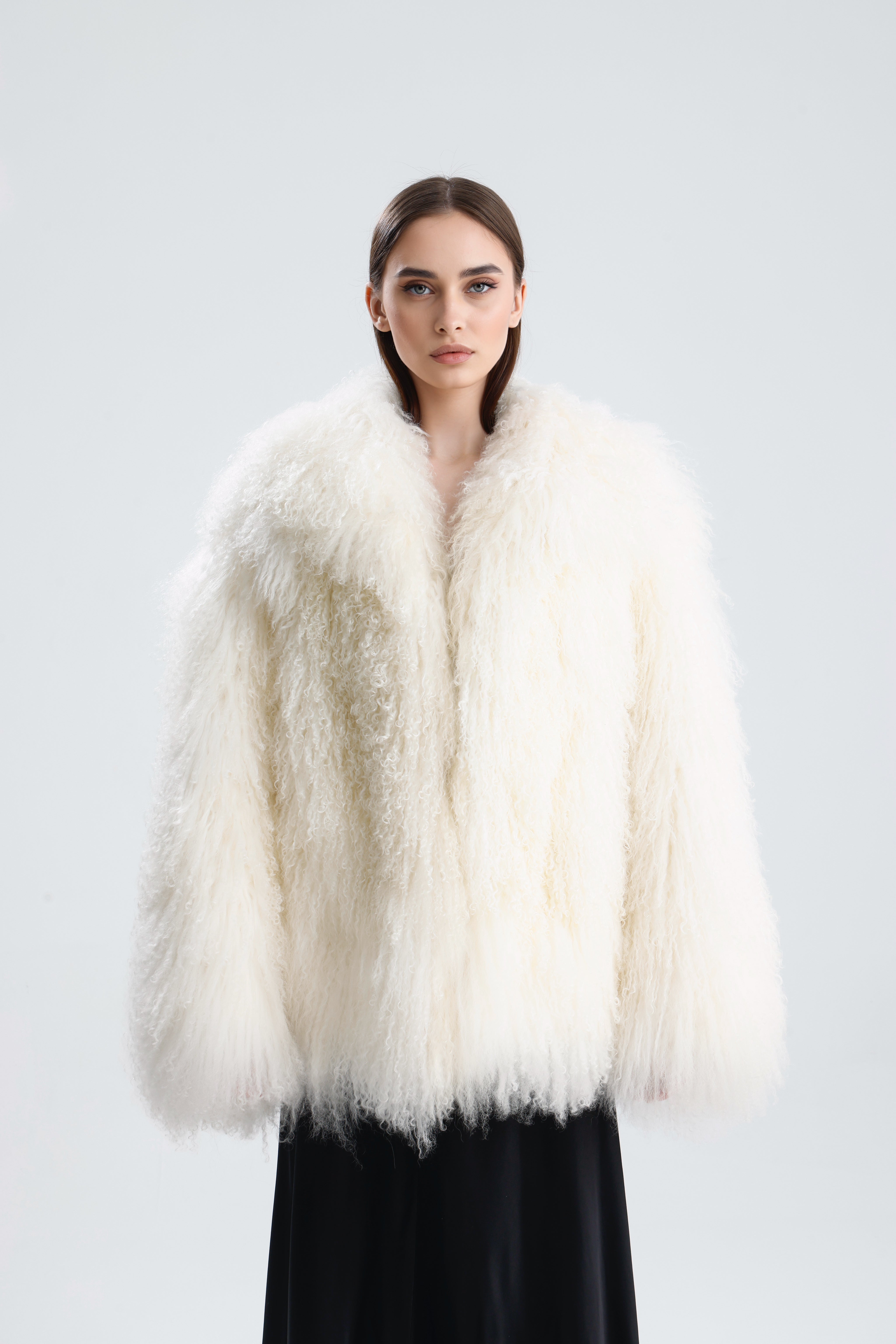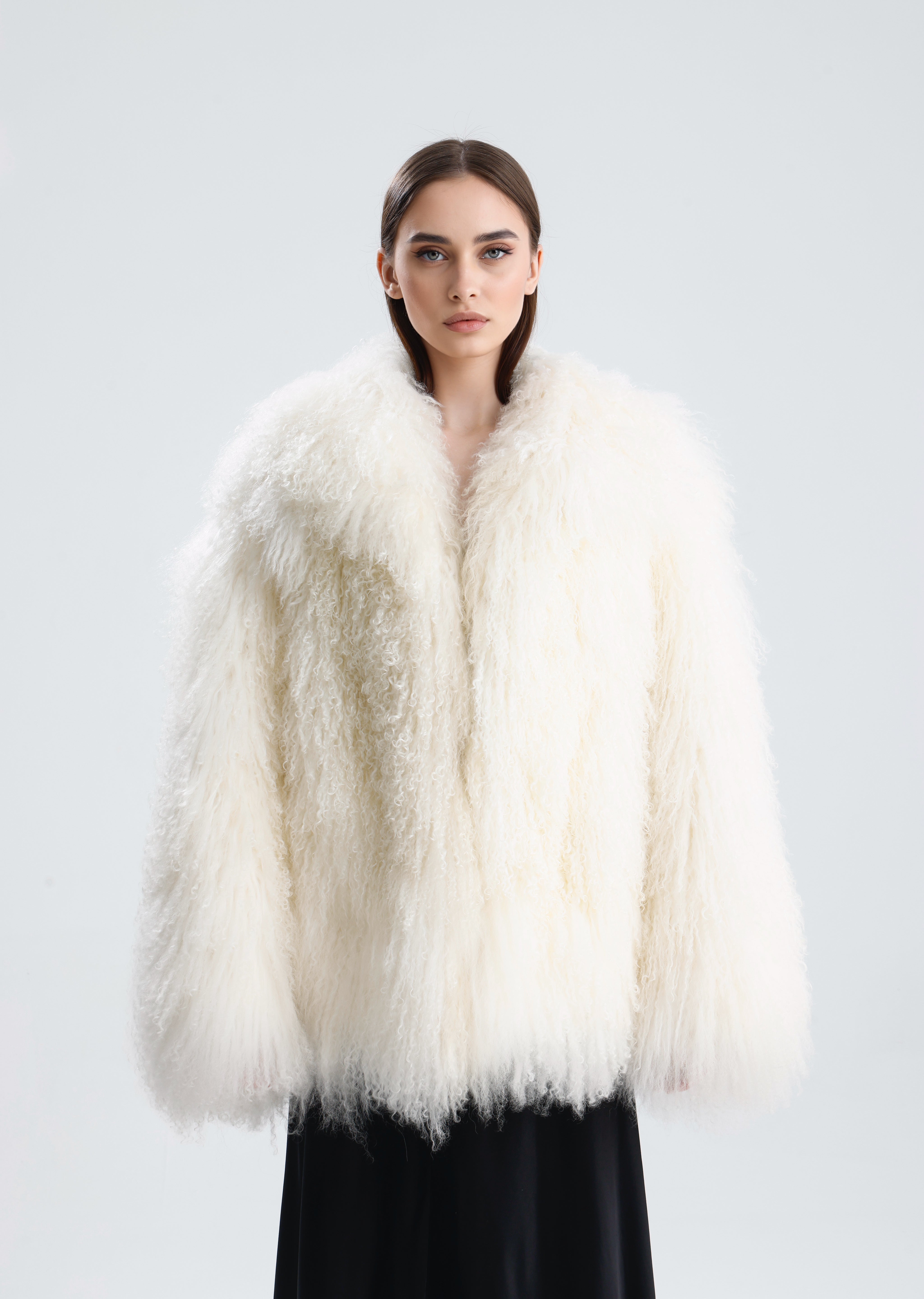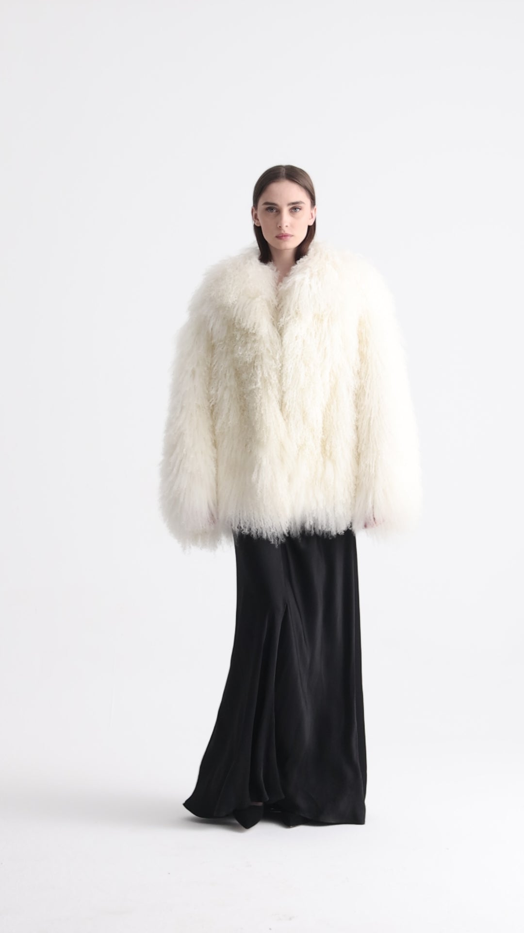 A true showstopper, Lena is a voluminous Tibetan shearling coat in alabaster. Its textured cloud-like finish makes it the ultimate statement piece, perfect for women who want drama, warmth and elegance all in one.