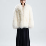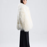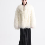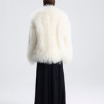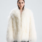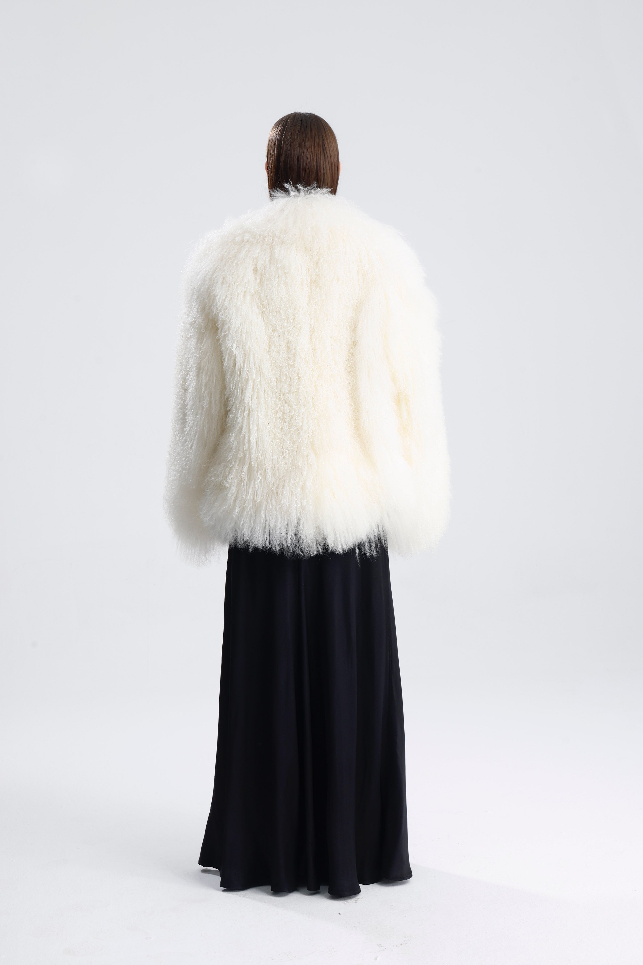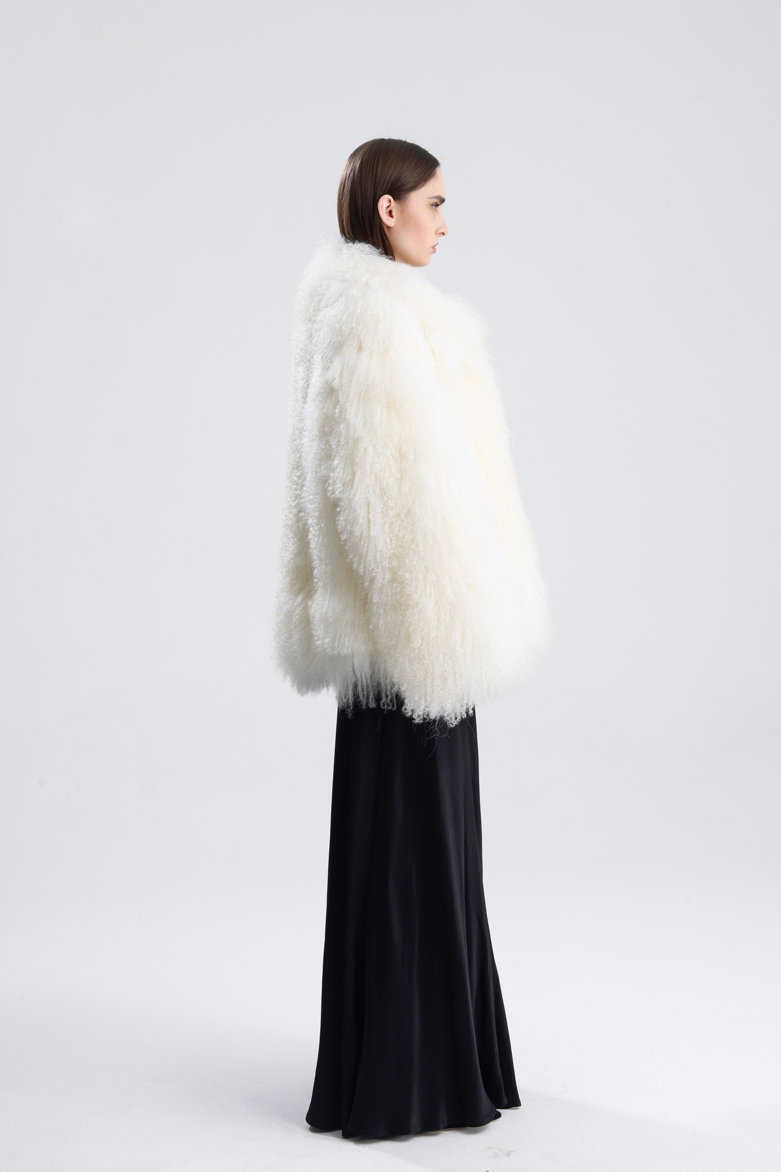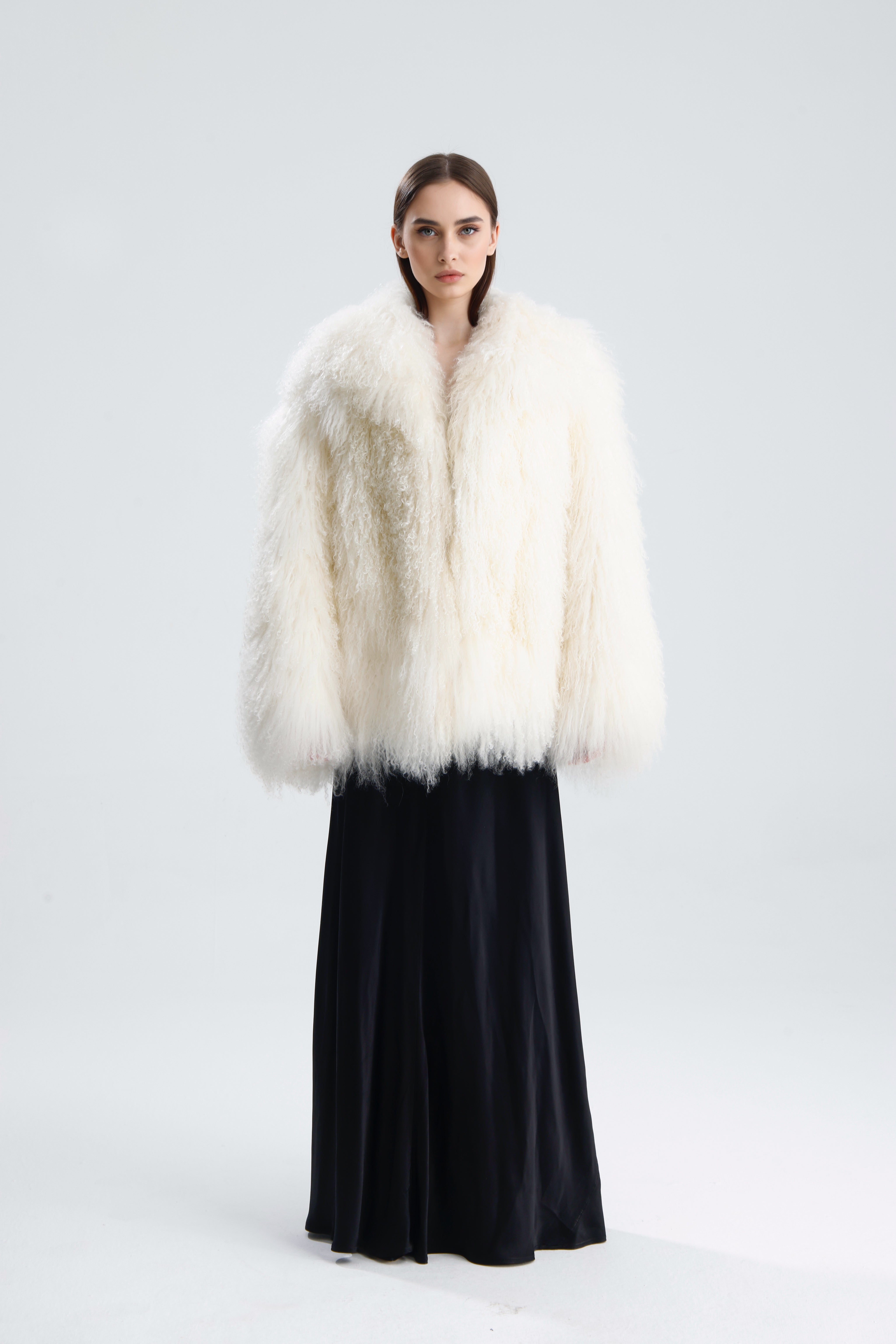 A true showstopper, Lena is a voluminous Tibetan shearling coat in alabaster. Its textured cloud-like finish makes it the ultimate statement piece, perfect for women who want drama, warmth and elegance all in one.