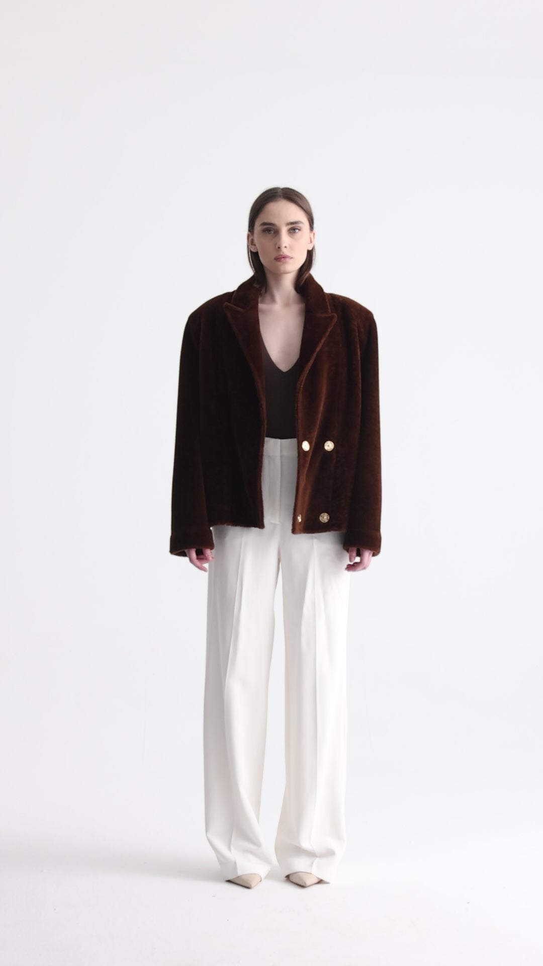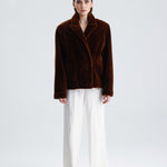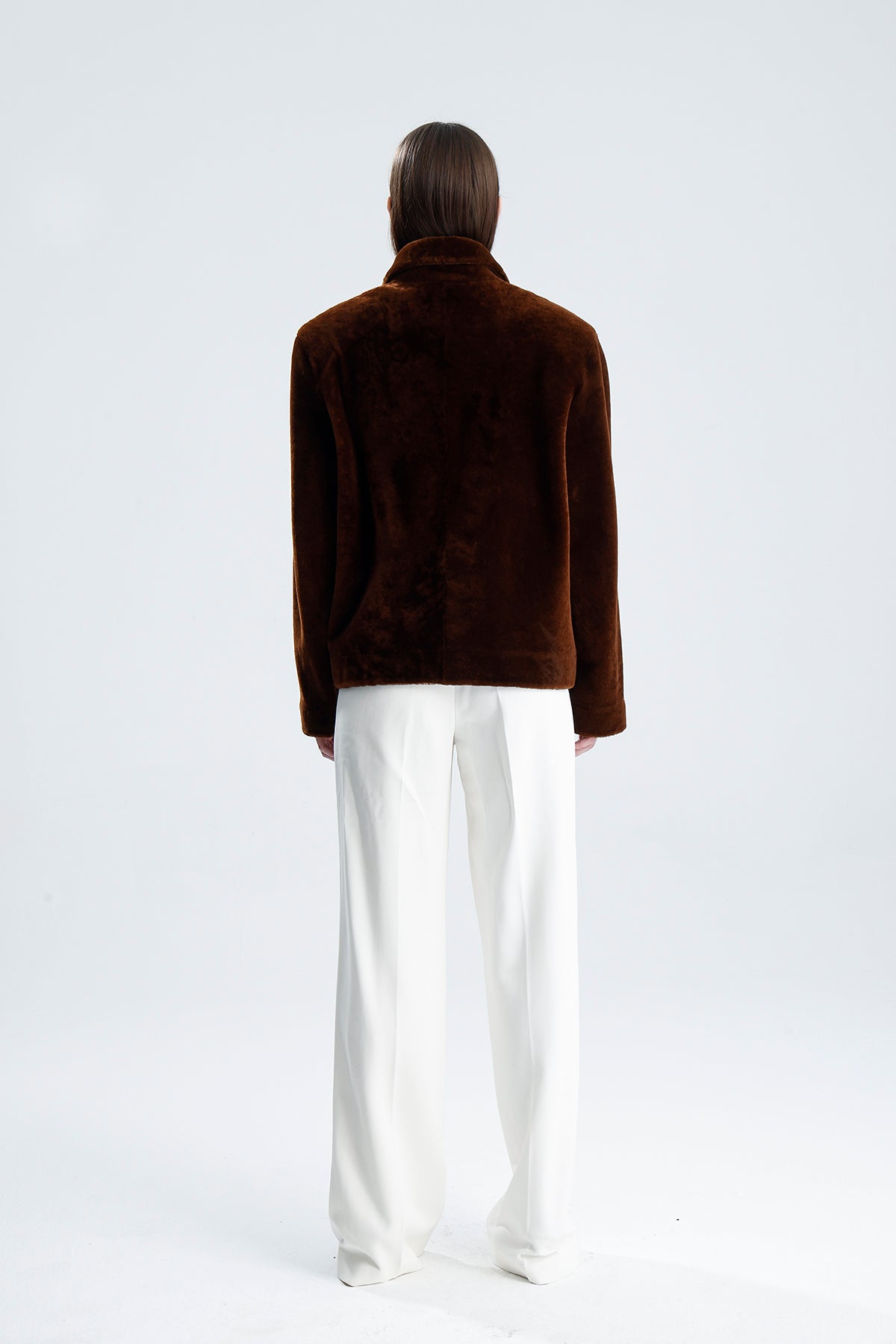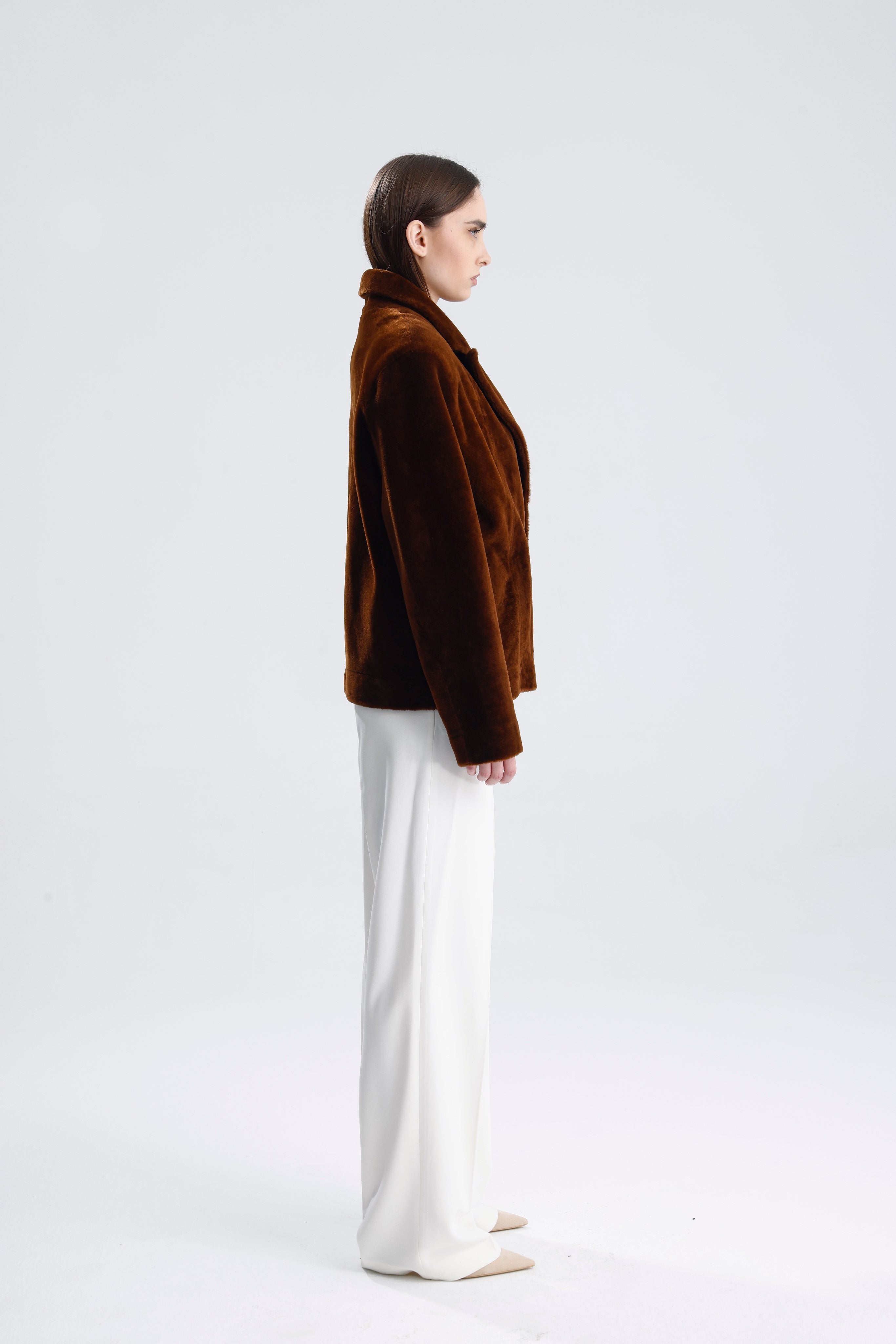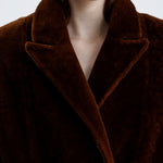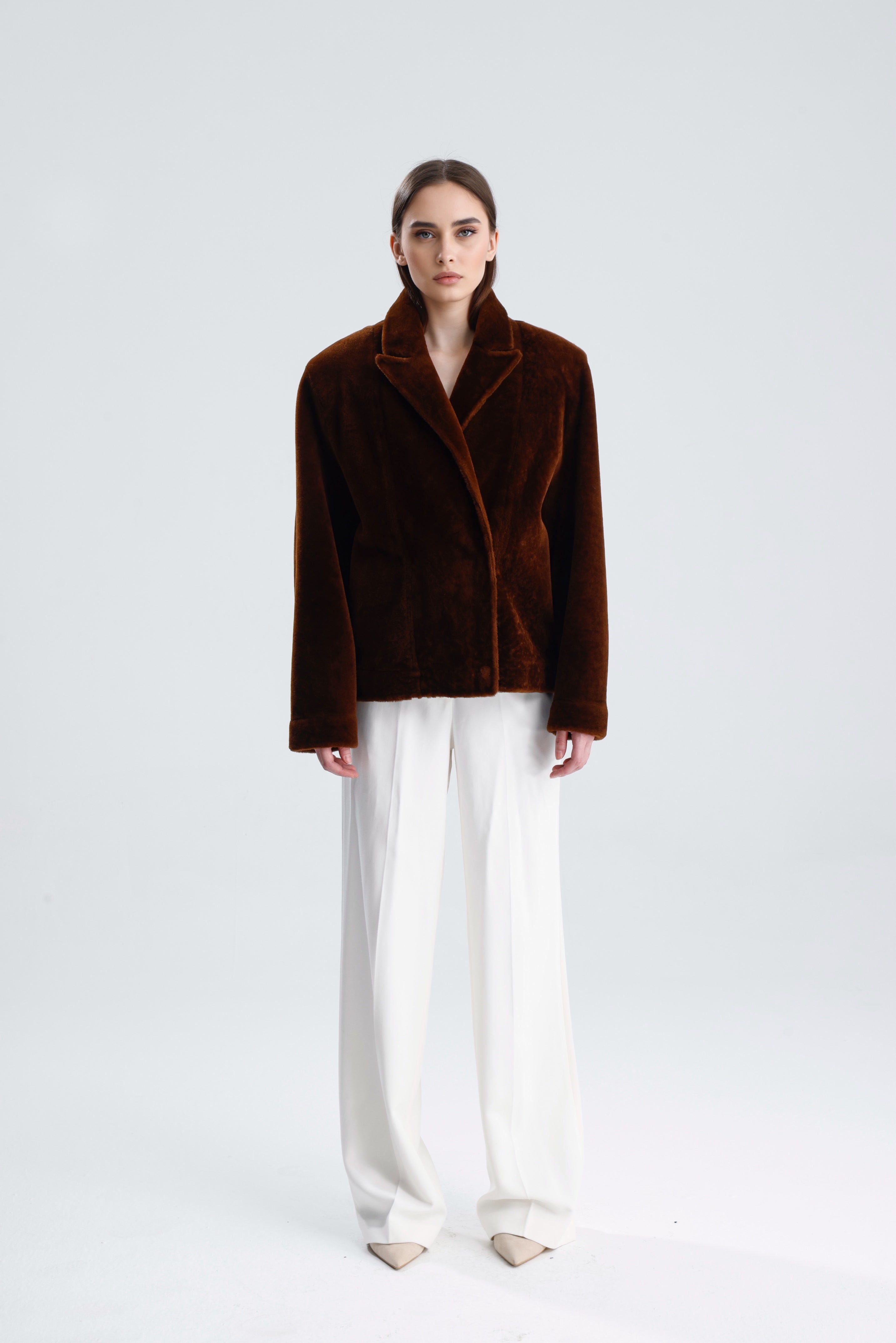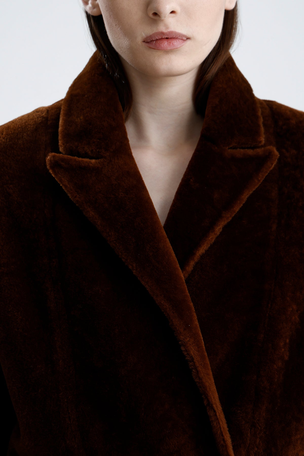 Mira embodies quiet luxury. A shorter cut in mahogany merino shearling, it delivers warmth and style in equal measure, perfect for everyday wear with a polished twist.