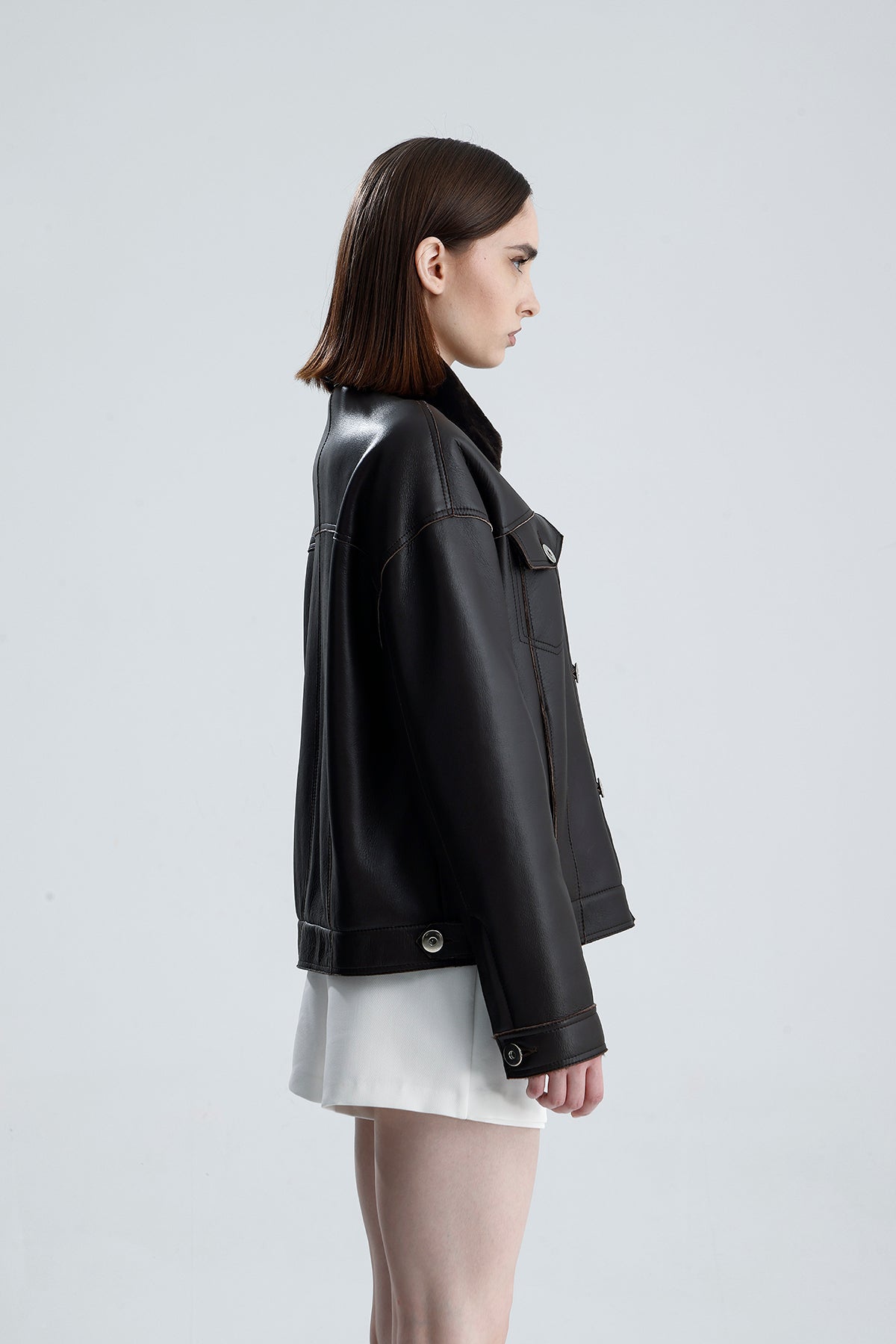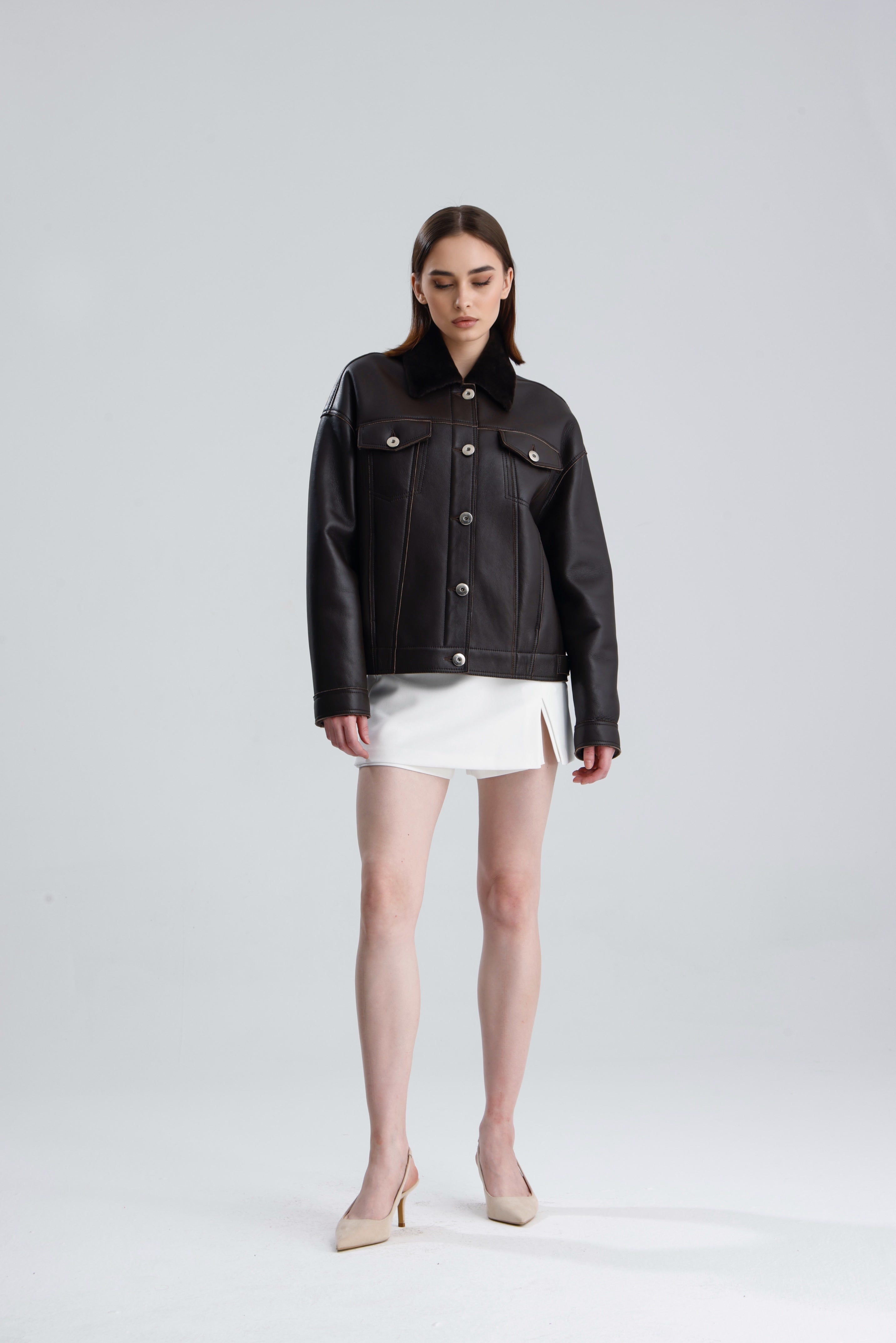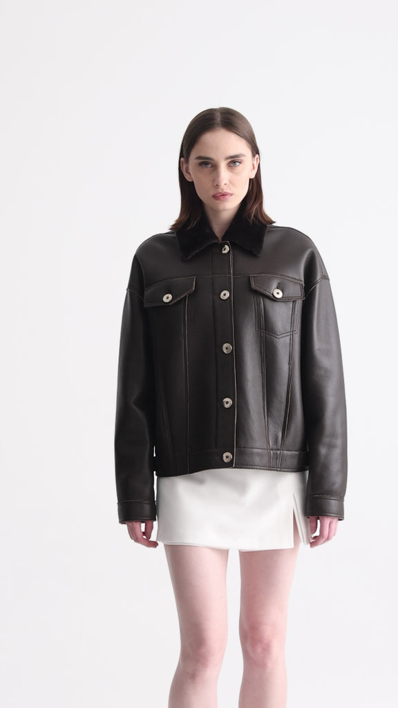 Minimalist yet cosy, Rey is a cropped merino shearling jacket in sandstone. Fully shearling lined for ultimate warmth, it combines everyday versatility with indulgent comfort, making it the perfect winter essential from casual weekends to city nights out.