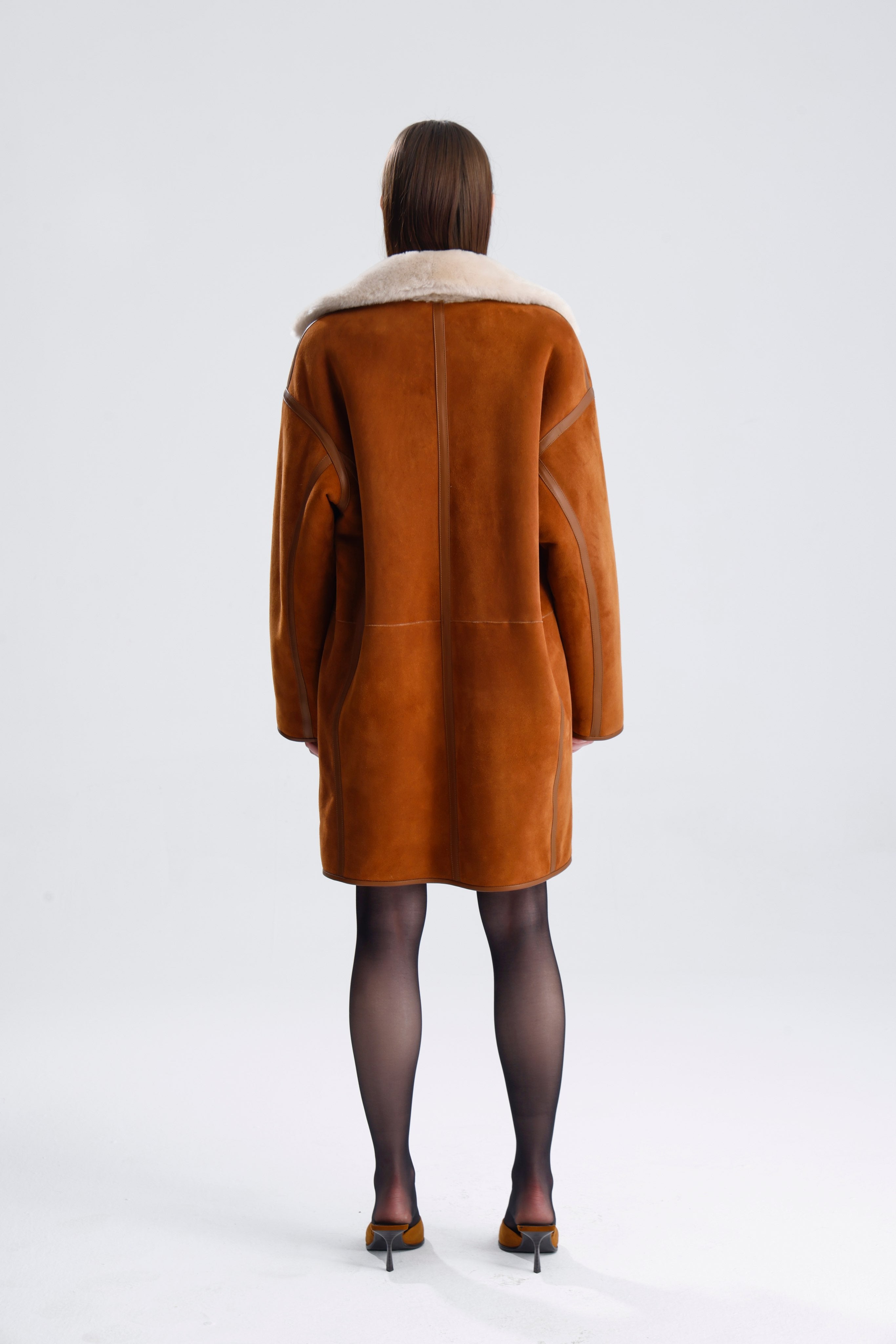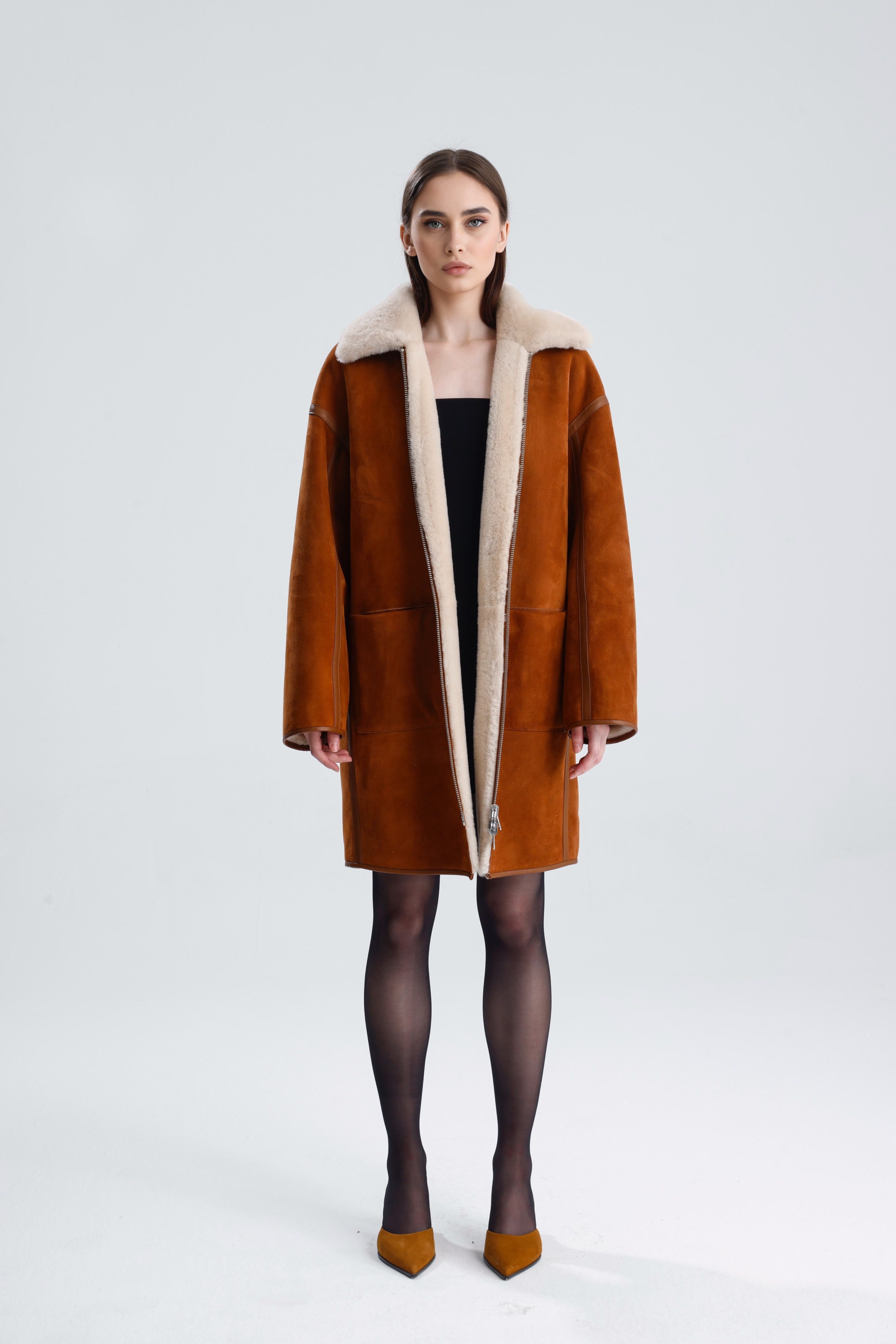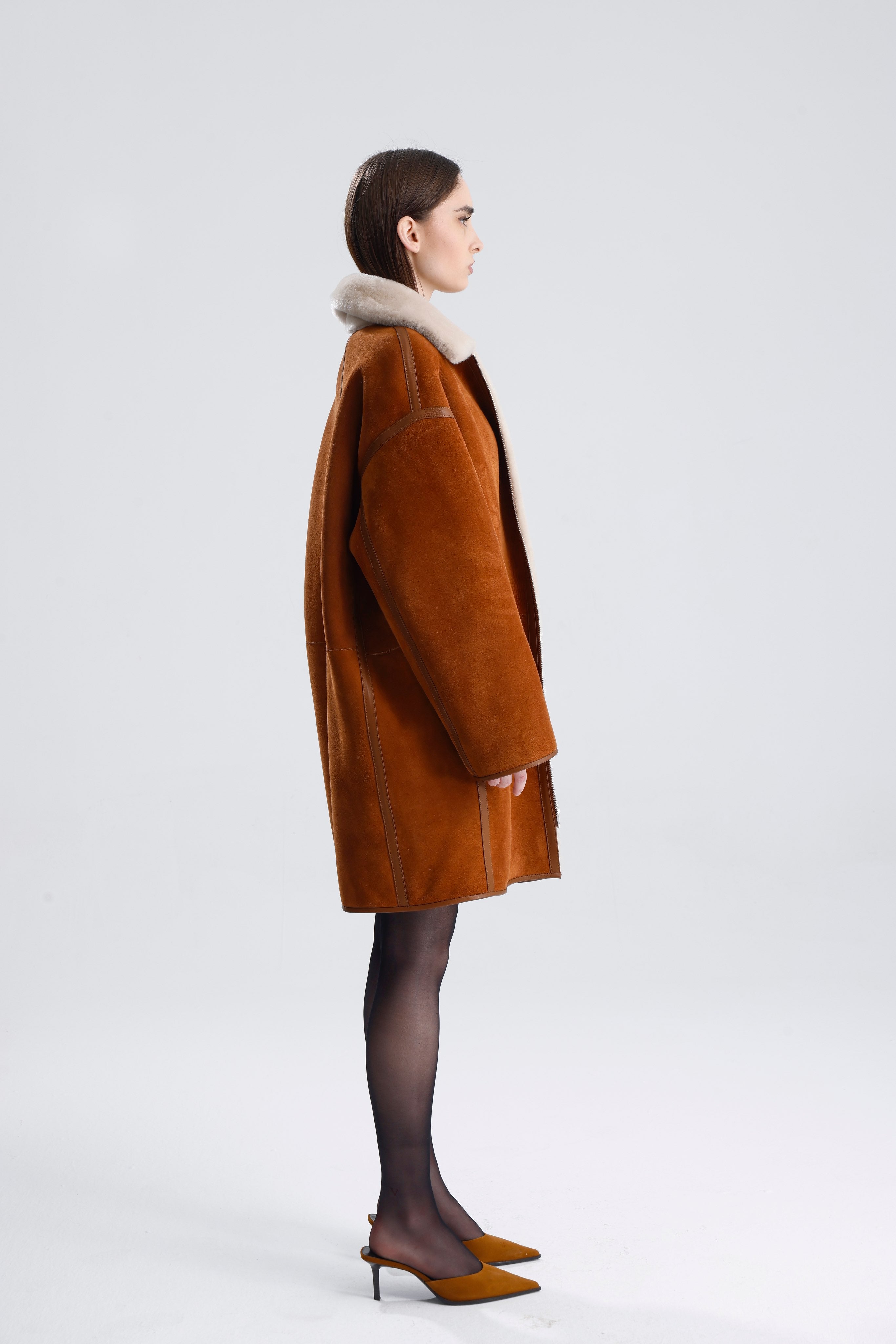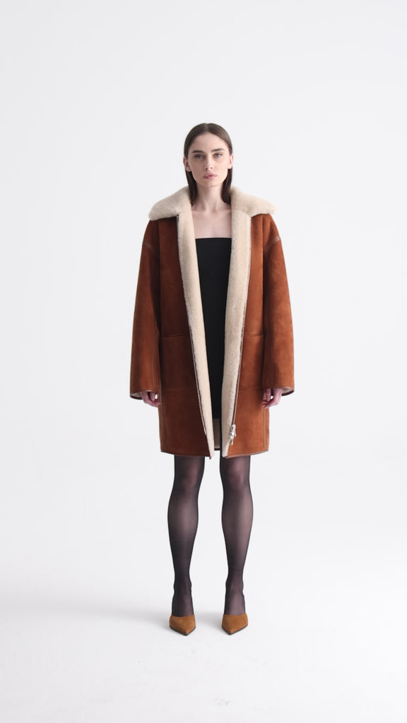 Rich and dramatic, Sienna is a longline lamb shearling coat in burnt umber. Its double sided construction reveals either a cocoon of soft shearling or a suede finish, making it the ultimate statement of luxury and adaptability.