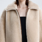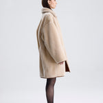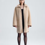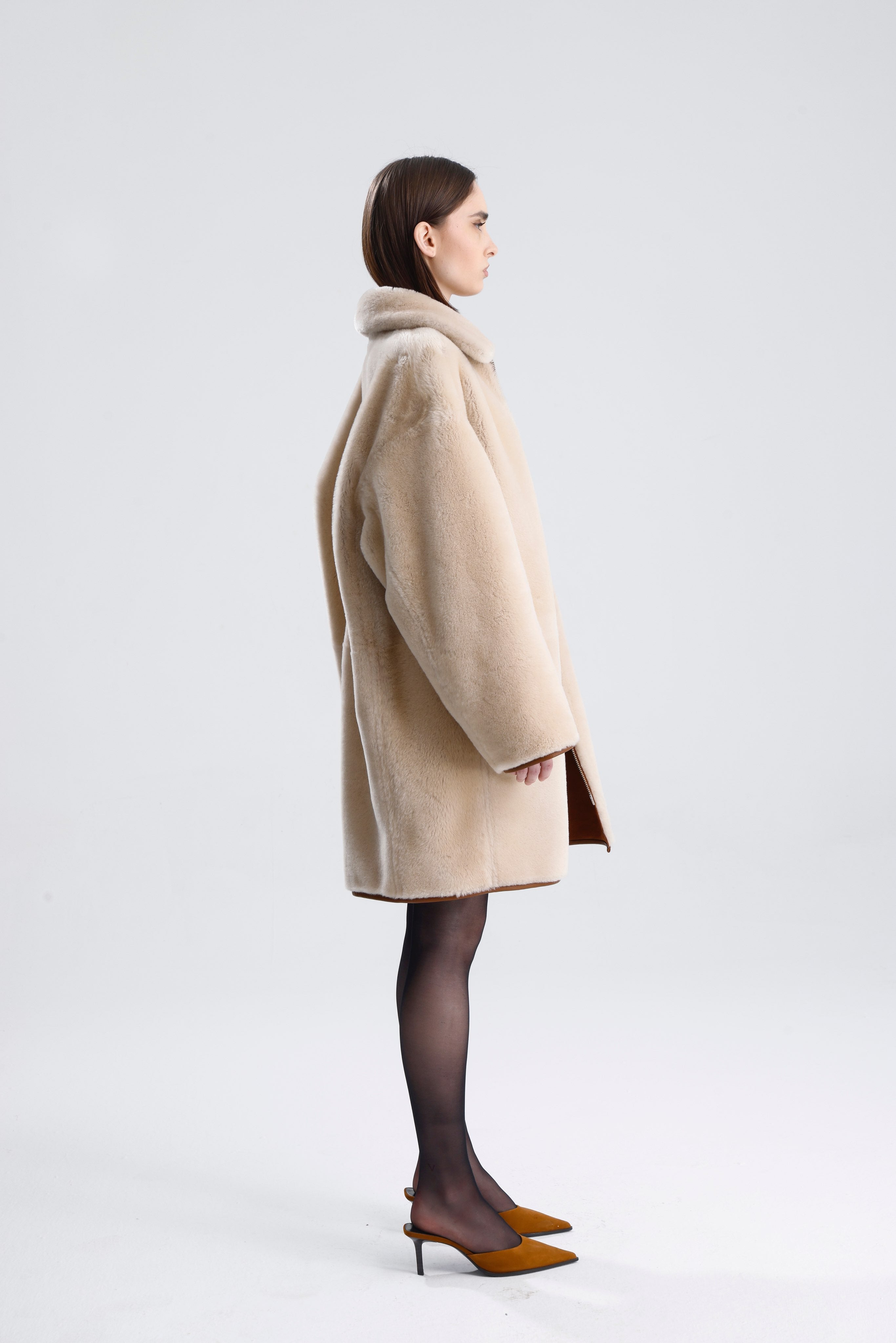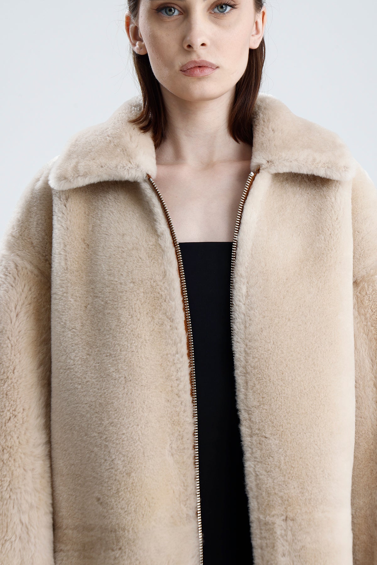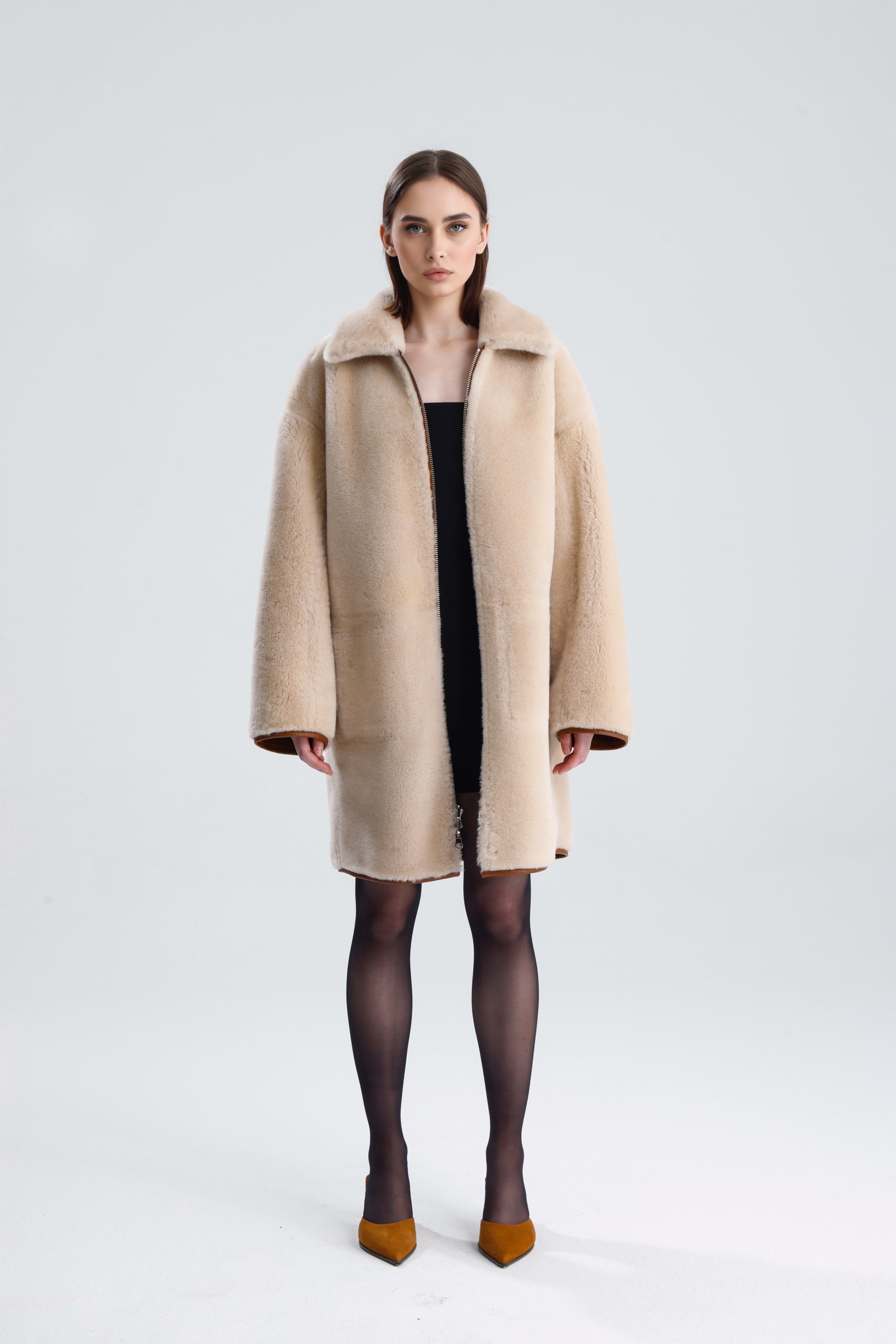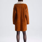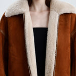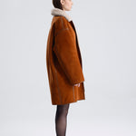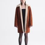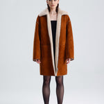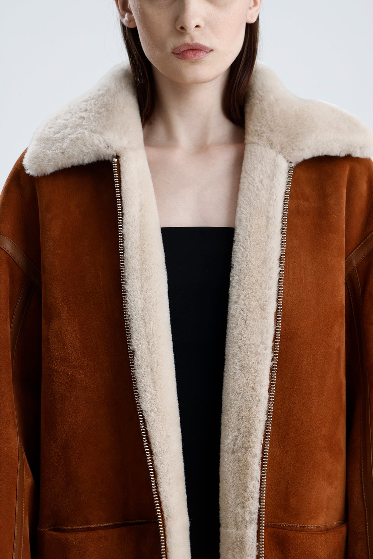 Rich and dramatic, Sienna is a longline lamb shearling coat in burnt umber. Its double sided construction reveals either a cocoon of soft shearling or a suede finish, making it the ultimate statement of luxury and adaptability.